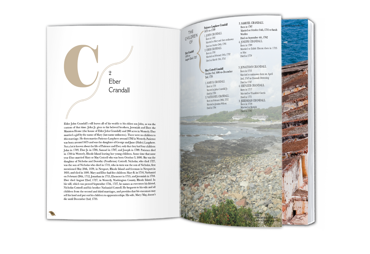 As this project was a compilation of my grandmothers research, I was also working as editor and text compiler. The document of text had been written over several years and distributed throughout the family. What they hadn't seen was the images, illustrations, and the final pieces of the story including 3 generations. My effort on the text consisted of organizing the book into chapter pieces, each about a specific family member. The book is split into 2 family lines, which in the end get married. These two individuals are my great-grandparents.