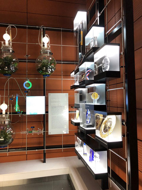 Biogen contracted Small Design Firm to redesign and update the corporate entry space of their headquarters in Kendall Square, Cambridge. I redeveloped the area including removal of some terrarium bulbs, re-allocating space for the data-driven terrarium installation to the left wall and developing a case layout for a variety of awards on the right. The final design was able to house 12 awards while still displaying the energy creation and consumption of the Biogen buildings.